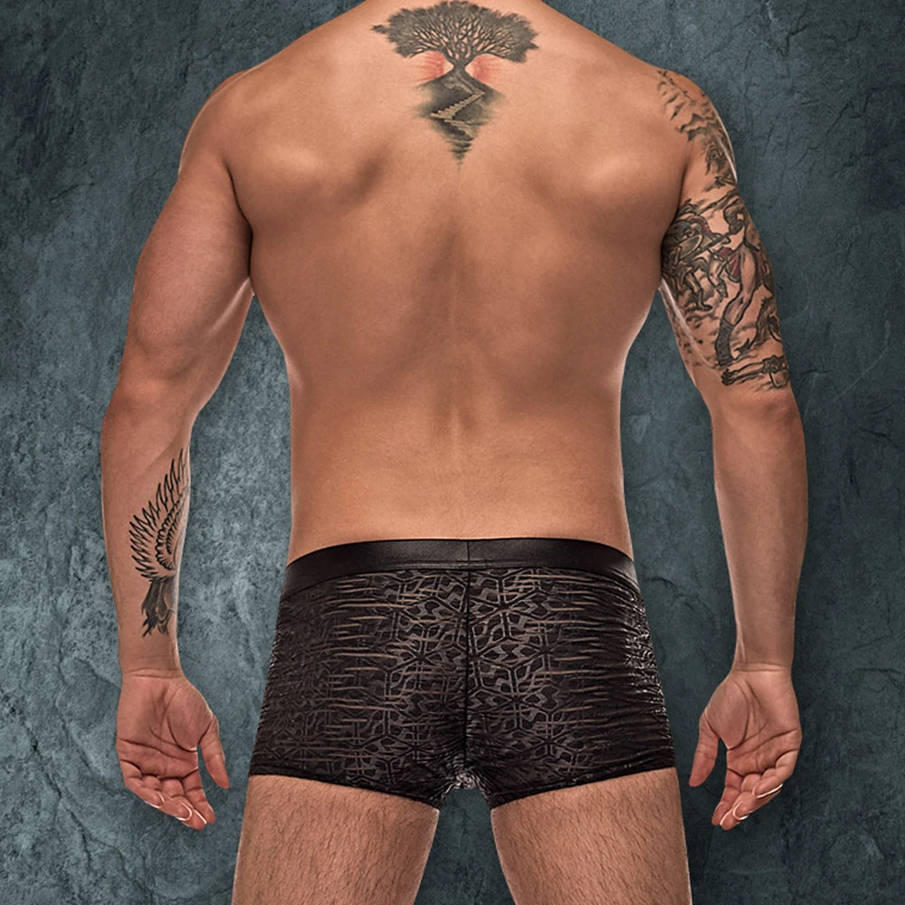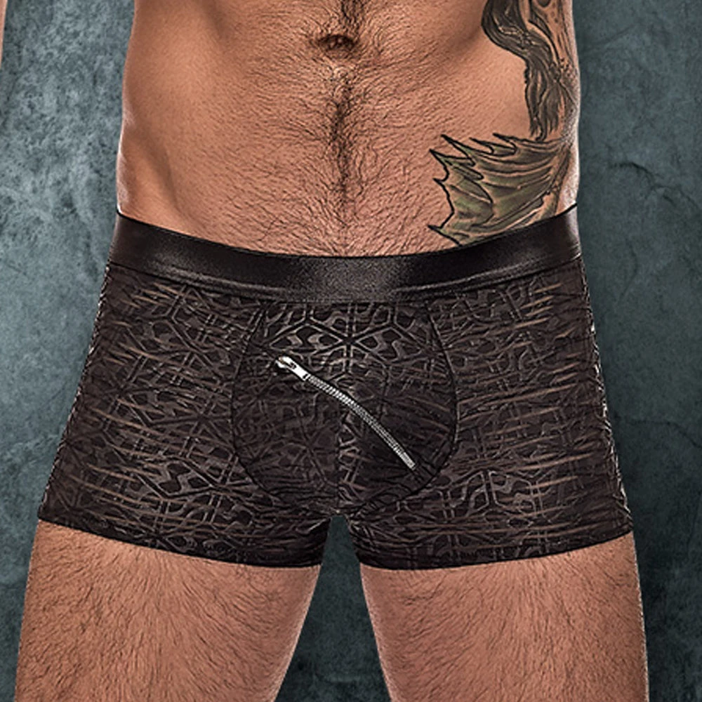 From the Zip It collection by Male Power, this style includes: a short featuring a contoured pouch with a diagonal pouch zipper with a protective flat and a slimming, wet-look waistband. Semi Sheer burnout fabric with a tone on tone abstract pattern. Lightweight and breathable with all way stretch. . 95% Polyester 5% Spandex. Hand wash, cold. No bleach. Line dry.