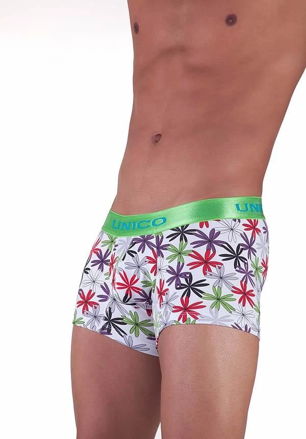 Unico’s Alegria Trunk features a bright green waistband with Unico stitched around, but the truly eye catching part of this low rise trunk is the bold floral print. This isn’t your granny’s floral print either. Each geometrically identical flower adds a great pop of fun and color to this fashion forward pair of underwear!